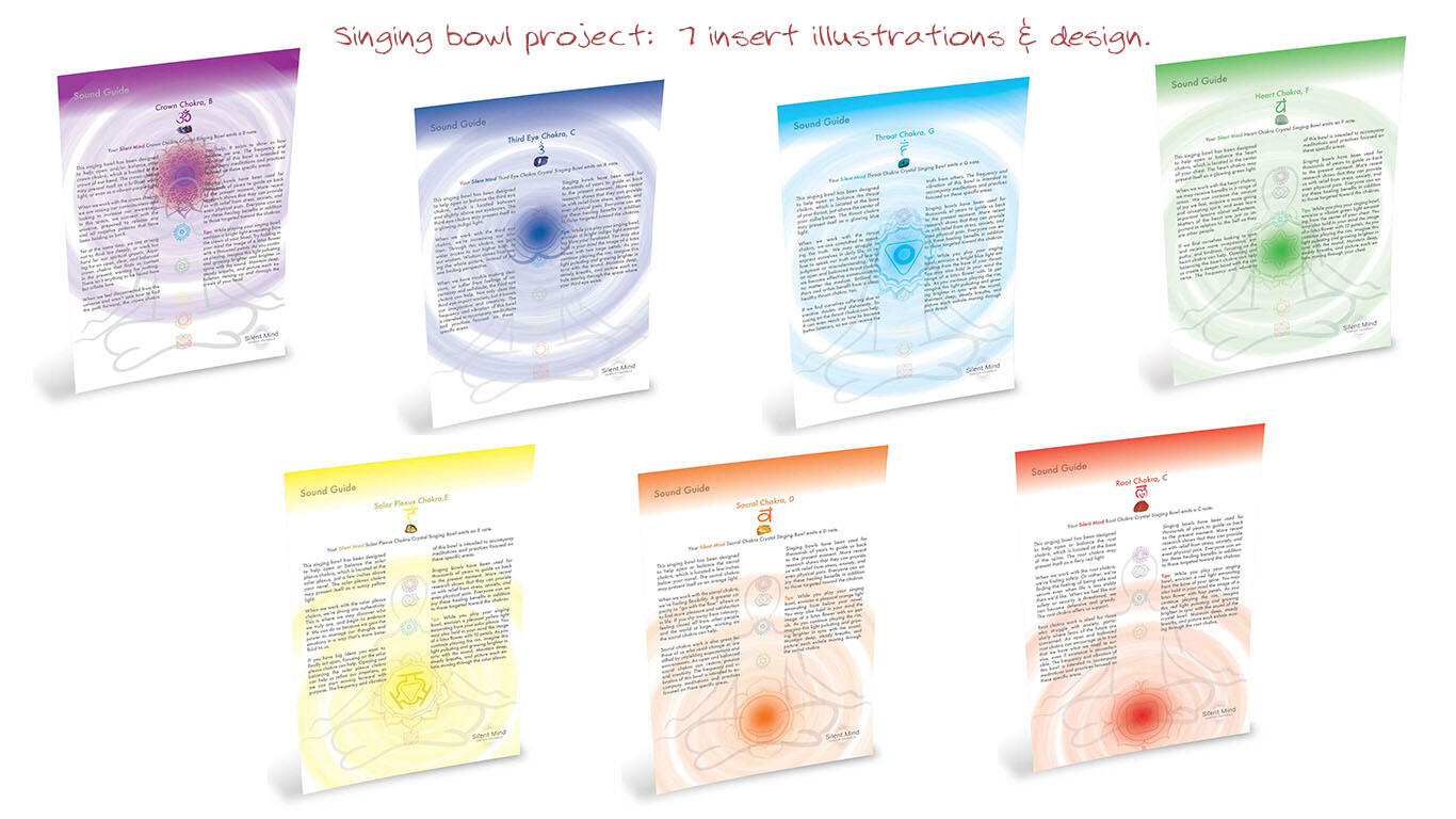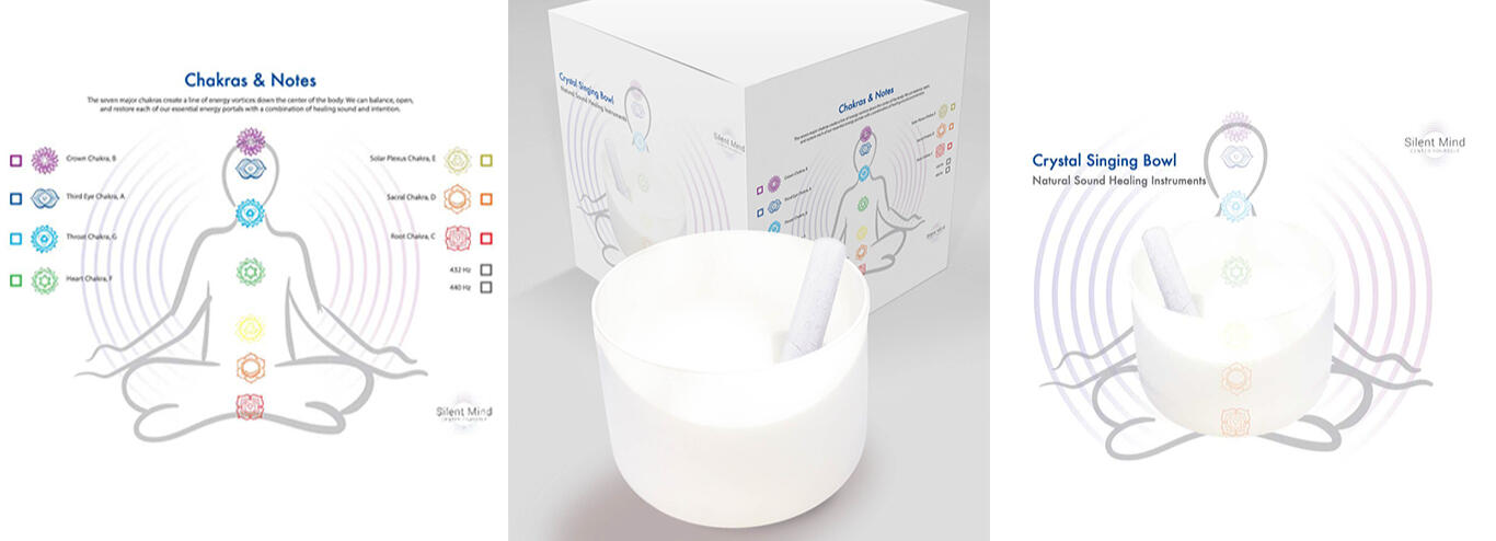 Crystal bowl branding & design: image artwork, design & differentiation, packaging design, insert design & differentiation. Project requirements: page layout, vector illustration, image creation and editing, color palette definition, effective typography and copywriting. Layout for Print & Web.